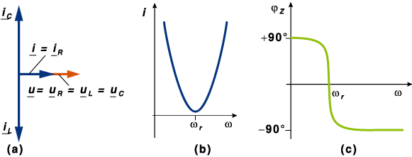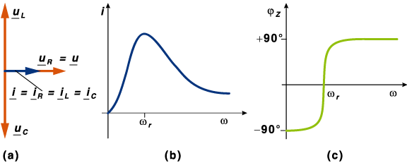 Die nachfolgende Abbildung illustriert den Reihenschwingkreis, (a): Strom-Spannungs-Zeigerdiagramm für Resonanz, (b): Stromamplitude und (c): Phasenwinkel für endliche Güte.