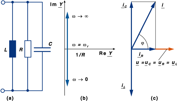 Die folgende Abbildung zeigt die Charakteristika eines Parallelschwingkreises, (a): Symbol, (b): Ortskurve des komplexen Leitwerts, (c): Strom-Spannungs-Zeigerdiagramm.
